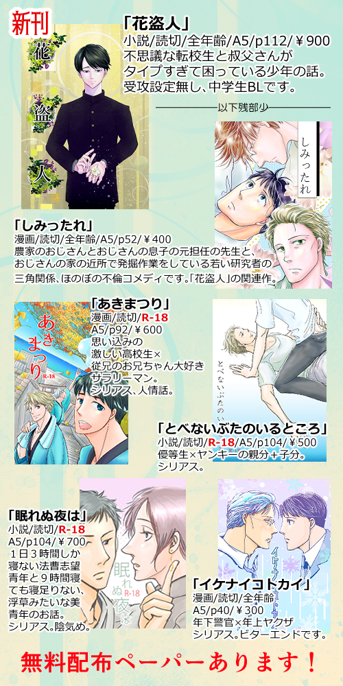 成人向エリアですが新刊「花盗人」を含め、全年齢の本もあります。